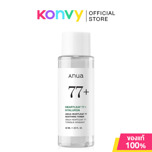 ANUA Heartleaf 77% Soothing Toner 40ml โทนเนอร์บำรุงผิวที่ได้รับความนิยมและมีกระแสโด่งดังในโลกโซเชียล เนื้อบางเบา แต่ให้ความชุ่มชื้นได้มากกว่า อุดมไปด้วยสารสกัดจาก Heartleaf (ใบคาวตอง) ถึง 77% ผสาน Hyaluron ช่วยลดอาการระคายเคือง และการอักเสบ ช่วยปลอบประโลมผิว พร้อมเติมความชุ่มชื้นโดยไม่ทำให้ผิวเหนอะหนะ