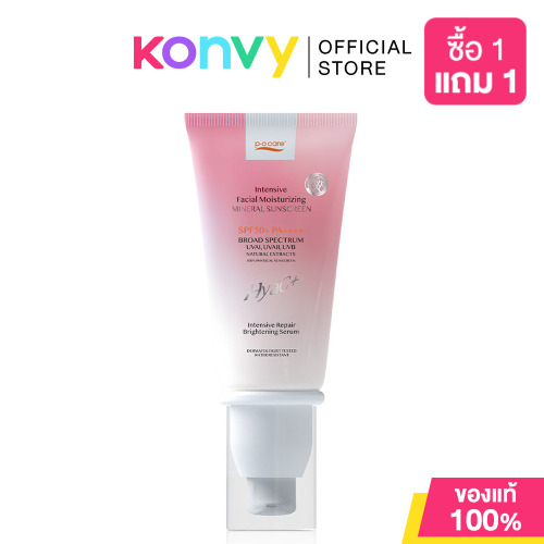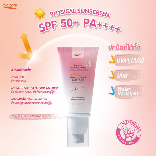P.O.CARE Intensive Facial Moisturizing Mineral Sunscreen 40ml กันแดดสำหรับผิวหน้า เนื้อเซรั่มบางเบา เกลี่ยง่าย ไม่เหนียวเหนอะหนะ ผสม Hya & Vitamin C ปกป้องผิวจากรังสี UVA1/UVA2/UVB ด้วยค่า SPF50+PA++++ ช่วยทำให้ผิวดูกระจ่างใส คงความชุ่มชื้นบนผิว ไม่เกิดอาการระคายเคืองได้ง่าย บำรุงพร้อมปรับสีผิวให้แลดูสว่างขึ้น