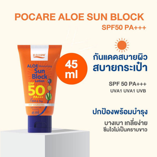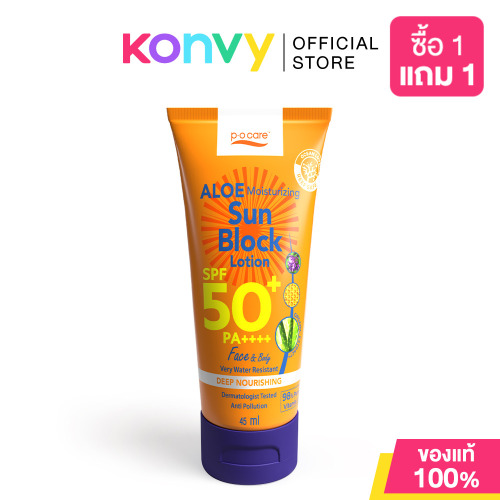 P.O.CARE Aloe Moisturizing Sun Block Lotion SPF50 PA+++ 45ml โลชั่นกันแดดสำหรับผิวหน้าและผิวกาย เนื้อโลชั่นกันแดดบางเบา สบายผิว ไม่เหนียวเหนอะหนะ ช่วยปกป้องผิวจากรังสีUVA/UVB1/UVB2 ป้องกันผิวแสบไหม้และอักเสบจากการโดนแสงแดด ทำให้ผิวเนียนนุ่ม ชุ่มชื้น ไม่แห้งกร้าน