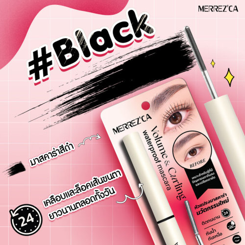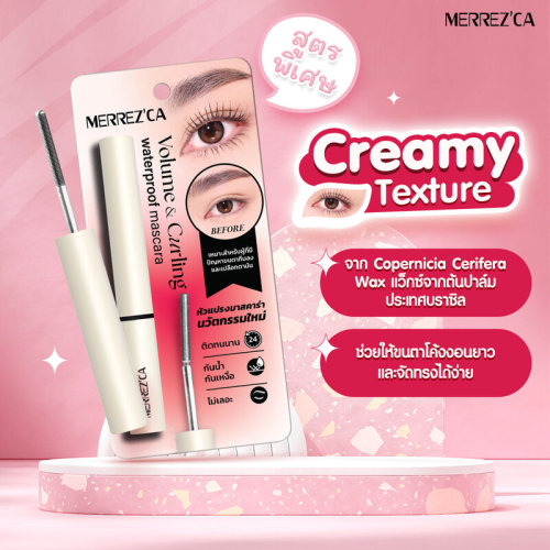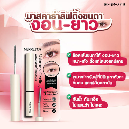 Merrezca Volume And Curling Waterproof Mascara 6.5g มาสคาร่าหัวแปรงเหล็ก นวัตกรรมใหม่ช่วยลิฟติ้งขนตางอน ยาว เรียงเส้นสวย ไม่จับก้อน ด้วยหัวแปรงดีไซน์พิเศษเข้าถึงทุกซอกทุกมุมของขนตาแบบเส้นต่อเส้น พร้อมเคลือบและล็อคเส้นขนตาให้งอน ยาว หนา เด้งตั้งแต่โคน สูตรพิเศษ Creamy Texture นุ่มลื่น เบาสบาย ไม่ร่วงหล่นทิ้งคราบแพนด้าจรดปลายตลอดทั้งวัน