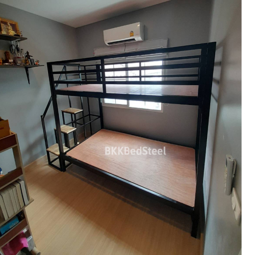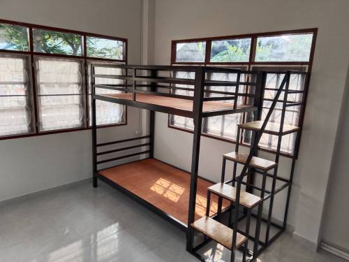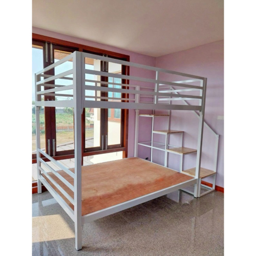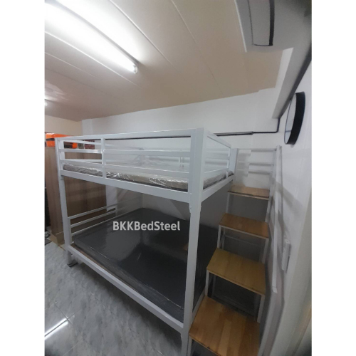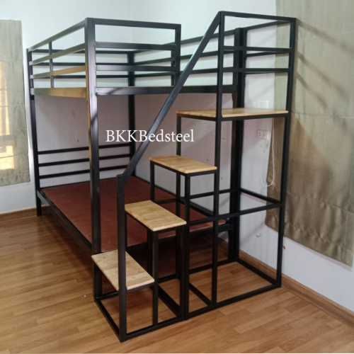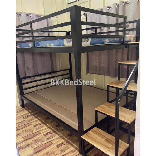 เตียง 2 ชั้น บันไดเดินขึ้นข้าง กันตกรอบเตียง ทำจากเหล็กกล่อง หนา1.2 มิล แข็งแรง ไม่โยก