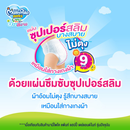 ด้วย แผ่นซึมซับซุปเปอร์สลิม ที่บางสบายพิเศษ*** ซึมซับได้นานถึง 9ชั่วโมง ผ้าอ้อมไม่ตุง รู้สึกบางสบายเหมือนใส่กางเกงผ้า