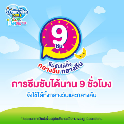 ด้วย แผ่นซึมซับซุปเปอร์สลิม ที่บางสบายพิเศษ*** ซึมซับได้นานถึง 9ชั่วโมง ผ้าอ้อมไม่ตุง รู้สึกบางสบายเหมือนใส่กางเกงผ้า