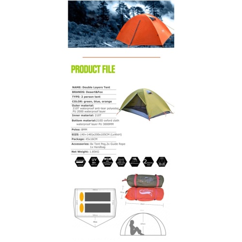 ➤Double Layer: เป็นเต็นท์ 2 ชั้นด้านนอกทำจากโพลีเอสเตอร์ 210T กันน้ำ PU 2000MM ด้านในเป็นชั้นตาข่าย ดีไซน์ 1 บานสำหรับเข้าและออก