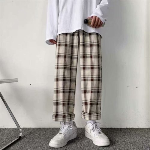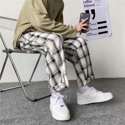 กางเกงขายาวลายสก็อตผู้ชายใหม่ญี่ปุ่นอินคู่รักเอวสูงและผ้าเดรปสูงตรงกางเกงขากว้างหลวม White 2XL