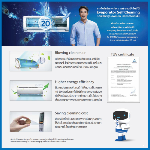 2) Evaporator Self Cleaning : ระบบทำความสะอาดอัตโนมัติ โดยการปรับอุณหภูมิให้ลดต่ำลงจนเกิดเป็นน้ำแข็งปกคลุมภายในเพื่อชะล้างสิ่งสกปรก เพียงกดปุ่ม โดยใช้เวลา 20 นาที