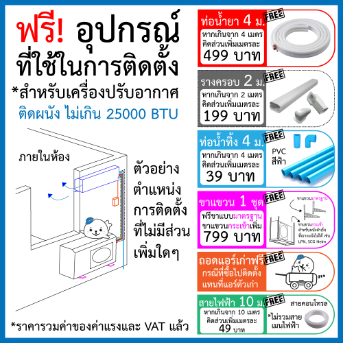 + แถมฟรี! ค่าถอดแอร์เก่า หากเป็นการติดตั้งแทนที่ตัวเก่า