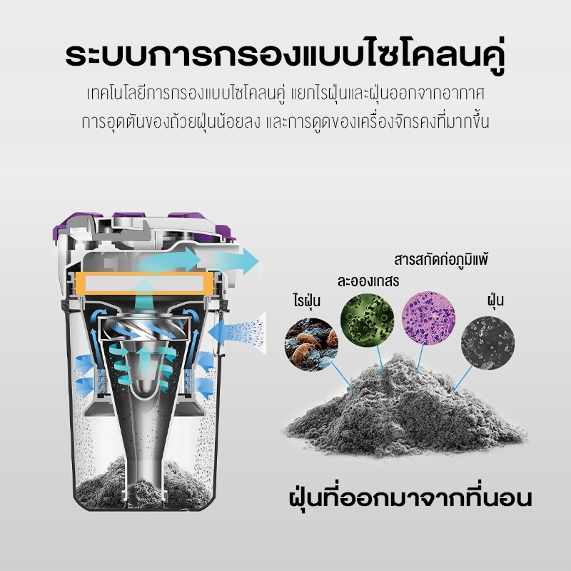 * ระบบการกรองแบบไซโคลน การกรองแบบหลายชั้นสามารถแยกสารก่อภูมิแพ้ของไรฝุ่นและฝุ่นละเอียดออกจากอากาศได้อย่างมีประสิทธิภาพ