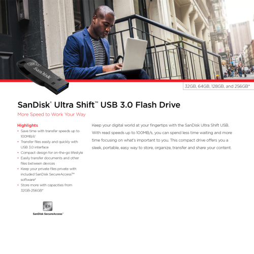 ให้โลกดิจิทัลของคุณอยู่ใกล้คุณเสมอเพียงปลายนิ้วด้วย SanDisk® Ultra Shift™ USB ด้วยความเร็วในการอ่านสูงสุด 100 MB/s2 คุณจึงเสียเวลารอน้อยลงและให้เวลากับสิ่งที่สำคัญสำหรับคุณได้มากขึ้น