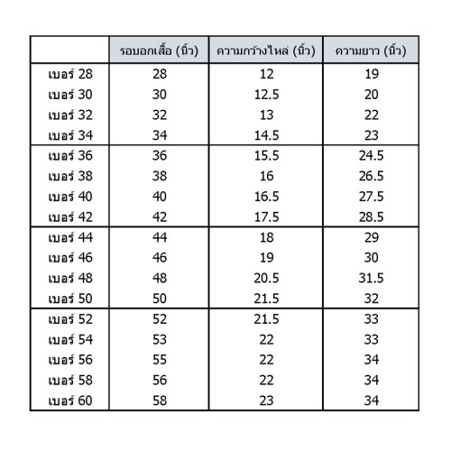 เบอร์ 40 ขนาดรอบอกของเสื้อ 40 นิ้ว ความกว้างไหล่ 16.5 นิ้ว ความยาว 27.5 นิ้ว