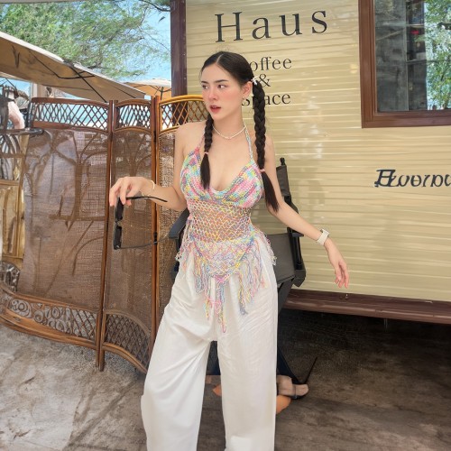 เสื้อไหมพรมถัก ทอผ้าฉลุ เหมาะกับใส่ไปทะเล 🧣 มีฟองน้ำให้ ฟรีไซต์ด้านหลังผูกเชือก ผ้าไม่ยืดน้า เป็นทรงสายเดี่ยวคล้องคอ