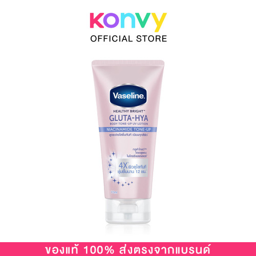 Vaseline Healthy Bright Gluta-Hya Body Tone-Up UV Lotion Niacinamide Tone-Up 170ml โทนอัพโลชั่น เนื้อบางเบา ไม่เหนียวเหนอะหนะ ช่วยอัพผิวให้ดูกระจ่างใส มอบสีผิวสม่ำเสมอ กลบจุดด่างดำและรอยดำอย่างเป็นธรรมชาติ พร้อมเติมความชุ่มชื้นนาน 12 ชั่วโมง