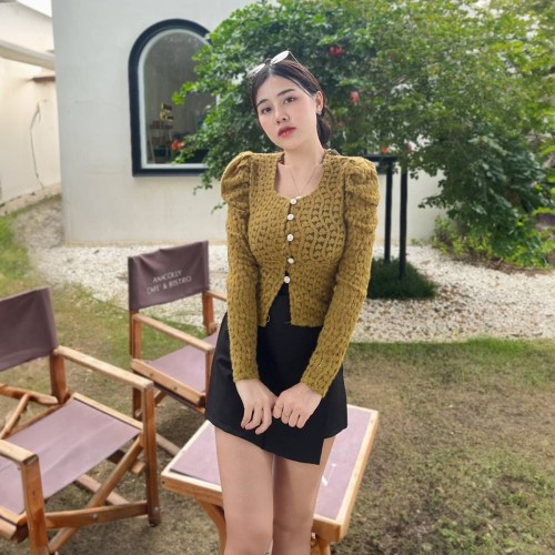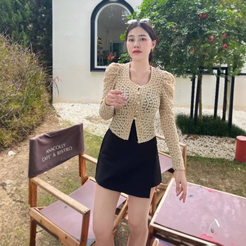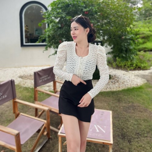 สวยงามตามกระแสงานตามเทรนด์ตลาดแฟชั่นตามหา งานลูกไม้มาแรงส์งานนี้เลย งานลูกไม้แต่งลายคลื่นสลับลายหัวใจทรงคอยูกระดุมหน้าแขนยาว เป็นงานลูกไม้ผ้ายืดตามตัว เป็นขนาดฟรีไซส์