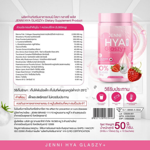 Jenni Hya Glaszy+ [5g x 10 Sachets] ผลิตภัณฑ์เสริมอาหารไฮยา อุดมสารสกัด 18 ชนิด พร้อมทั้งสารสกัดนำเข้าจากญี่ปุ่น อเมริกา เบลเยี่ยม สวิตเซอร์แลนด์ และสาธารณรัฐเช็ก