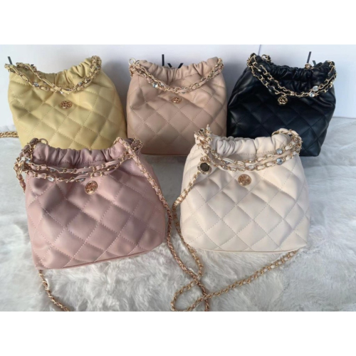 ด้านหน้าเเต่งเเบบสายโซ่สลับหนังเเละเม็ดเพชร มีสายยาวให้อีก 1 สาย สะพายครอสบอดี้เเละถือพร้อมถุงผ้า อุปกรณ์ ป้ายเเทร็ค