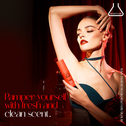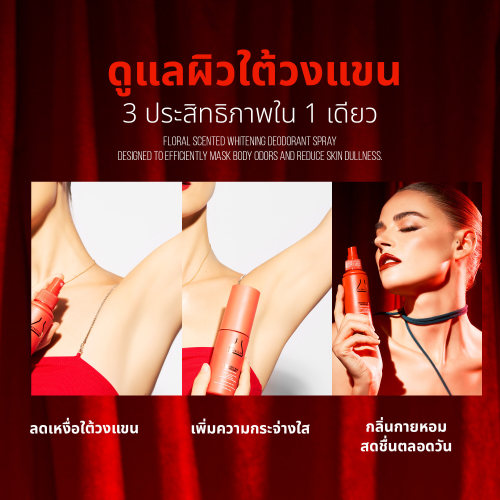 Floral scented whitening deodorant spray designed to efficiently mask body odors and reduce skin dullness.