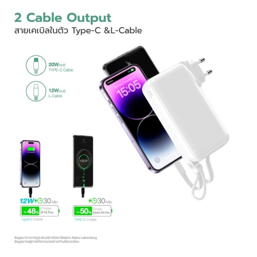 - Output จ่ายไฟออกได้ 4 พอร์ต USB, Type-C ,L- Cable และ Type-C Cable
