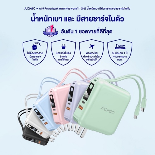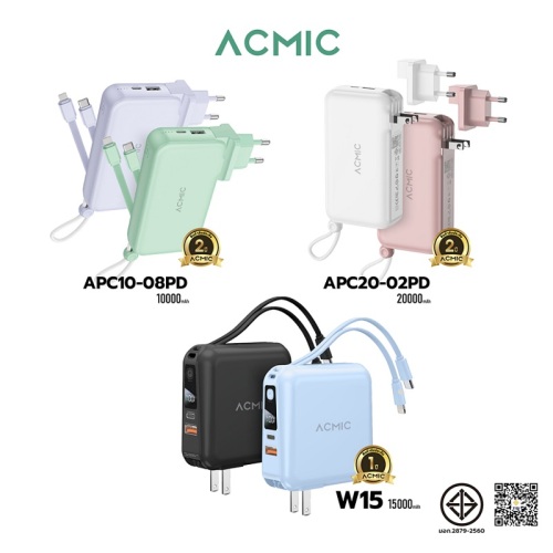 ACMIC W15 15000mAh/ APC20-02PD 20000mAh/ APC10-08PD 10000mAh / APC10-03PD พาวเวอร์แบงค์ชาร์จเร็วPD20W ขาปลั๊ก/สายชาร์จในตัว