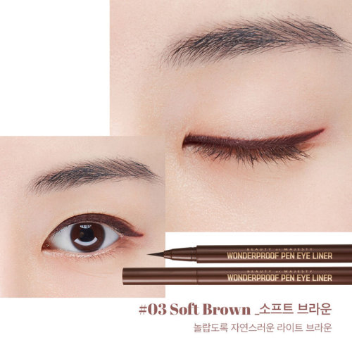 BOM Wonderproof Pen Eyeliner 0.5g #03 Soft Brown อายไลเนอร์สูตรกันน้ำ กันเหงื่อ ติดทนยาวนาน เนื้อสัมผัสนุ่มลื่น มีให้เลือกหลายเฉดสี เข้ากับทุกสไตล์การแต่งหน้า มาพร้อมปลายเรียวเล็กควบคุมเส้นได้ง่าย คมชัด สามารถล้างออกง่ายด้วยน้ำอุ่น ไม่ทิ้งคราบ