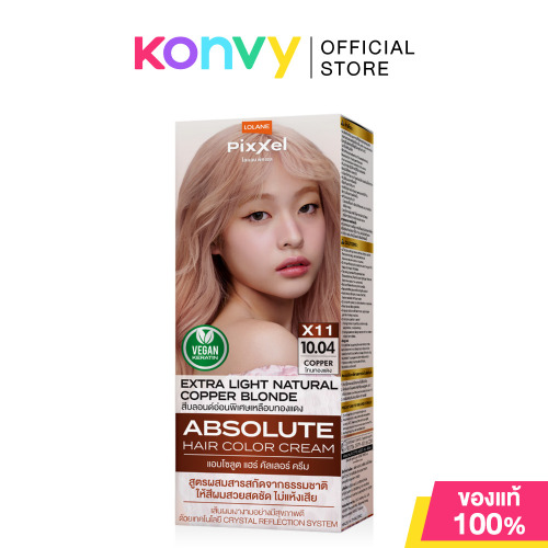 Lolane Pixxel Absolute Hair Color Cream 90g #X11 Extra Light Natural Copper Blonde 10.04 ครีมเปลี่ยนสีผมสูตรผสมสารสกัดจากธรรมชาติด้วย ANTIOXIDANT COMPLEX จาก Vitamin E และ Green Tea Extract และคุณค่าจากอนุพันธ์ Meadowfoam Seed Oil ที่ให้สีผมสวยคมชัดติดทน เสริมความแข็งแรงด้วย Vegan Keratin บำรุงลึกสู่แกนผมให้ความเงางามหลังทำสีด้วยเทคโนโลยี CRYSTAL REFLECTION SYSTEM