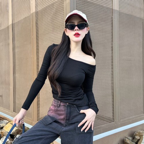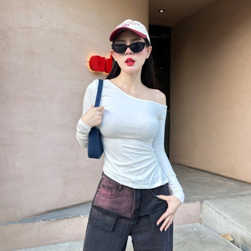 เสื้อยืดแขนยาวรัดรูป แต่งจีบย่นข้าง เพิ่มความเพรียว 🌼 ผ้าเรย่อนยืดเยอะ เสื้อปาดไหล่ งานตามหา สไตล์เกาหลี สายฝอ รุ่น แขนยาวปาดเฉียง