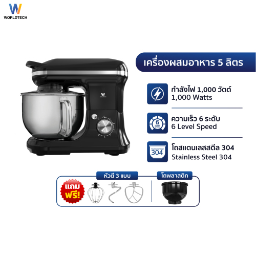 ✅ Worldtech เครื่องผสมอาหารอเนกประสงค์ เครื่องตีแป้ง เครื่องตีไข่ เครื่องผสมแป้ง โถความจุ 5 ลิตร แบบตั้งโต๊ะ