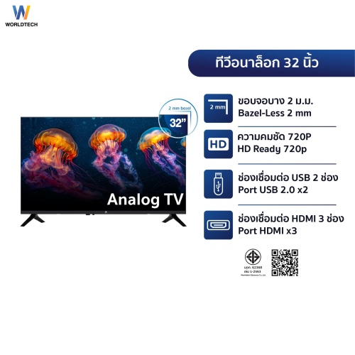 Worldtech 32 นิ้ว LED TV Analog อนาลอค ทีวี HD Ready ฟรี สาย HDMI (2xUSB, 2xHDMI) ราคาพิเศษ