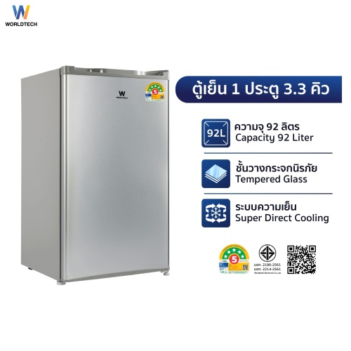 ✅ Worldtech ตู้เย็นขนาดเล็ก 3.3 คิว/ 92 ลิตร/ 1 ประตู