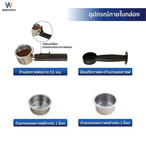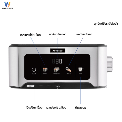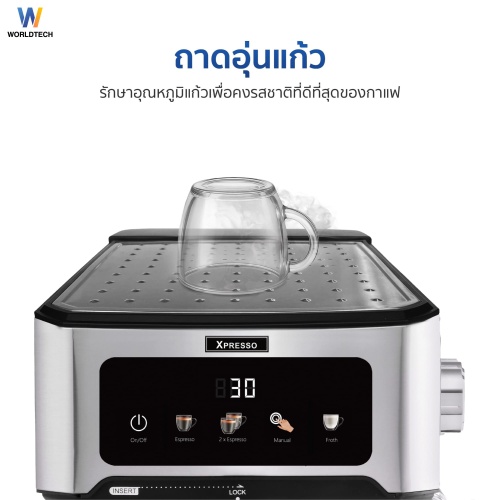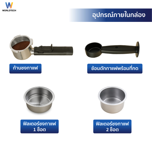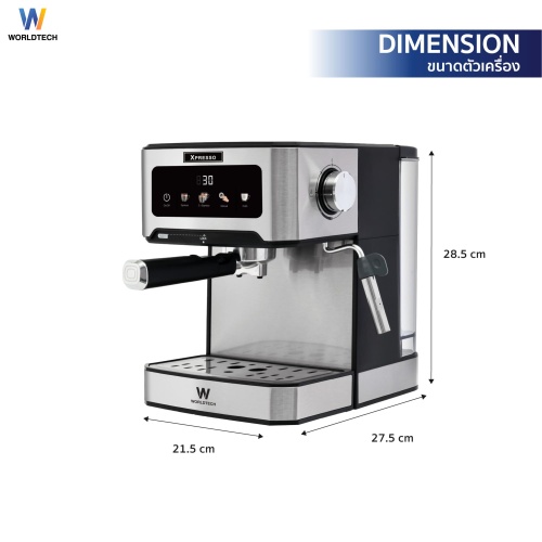 Worldtech Xpresso เครื่องชงกาแฟเอสเปรสโซ่เข้มข้น รุ่น WT-CM404 เครื่องชงกาแฟ เครื่องทำกาแฟเอสเปรสโซ่ เครื่องชงกาแฟอัตโนมัติ Espresso ปรับความเข้มข้นของกาแฟได้ สกัดด้วยแรงดันสูง 20 บาร์ + พร้อมชุดด้ามชงกาแฟ รับประกัน 1 ปี