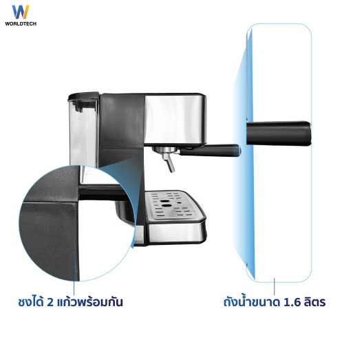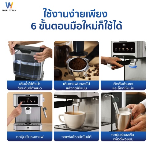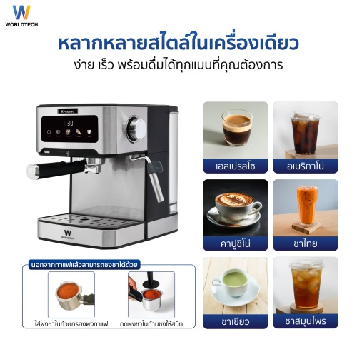 ✅ Worldtech เครื่องชงกาแฟอัตโนมัติ เครื่องทำกาแฟ Espresso ปรับความเข้มข้นของกาแฟได้ สกัดด้วยแรงดันสูง 20 บาร์