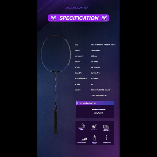 - 30T MITSUBISHI CARBON SHEET ไม้แบดระดับไฮเอนด์ ช่วยเพิ่มความแข็งแกร่งของเฟรมไม้เพื่อให้มั่นคง ซึ่งมีความเสถียรและมีประสิทธิภาพ