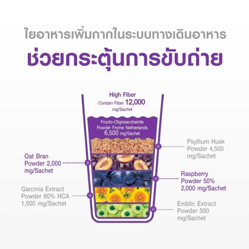 - ใยอาหารสูง มีใยอาหาร 12,000 มก./ซอง