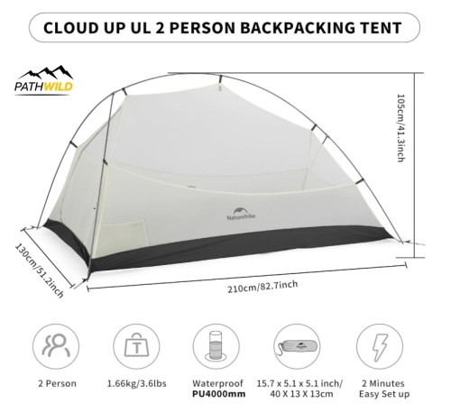 Cloud up 2 กันฝน ลม หิมะ ด้วยผ้า 15D Nylon เคลือบ Silicone, PU 1500+ ระบบระบายอากาศดี นอนได้ 1-2 คน เต็นท์น้ำหนัก 1.6 kg (รวมอุปกรณ์)