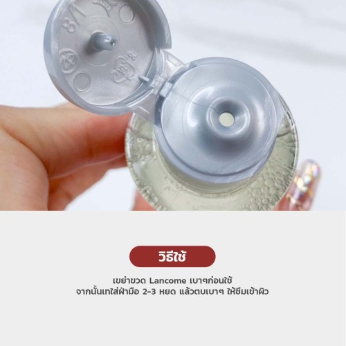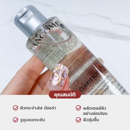Lancome Clarifique Double Essence เอสเซ้นส์หรือน้ำตบปรับผิวใสลดความหมอง เวลาใช้ต้องเขย่าเพื่อให้เนื้อเอสเซ้นส์แบบ bi-phase ซึ่งเป็นน้ำกับน้ำมันผสานให้เข้ากันค่าา มาในเนื้อน้ำใสๆ บางเบา ใช้เมื่อไหร่ก็สดชื่น จะเทใส่ฝ่ามือแล้วตบเข้าผิวก็ได้ หรือจะใช้เทใส่สำลีแล้วทำเป็นมาส์กหน้าก็เริ่ด มีส่วนผสมของเอนไซม์ผลไม้ช่วยผลัดเซลล์ผิวอย่างอ่อนโยน และสารสกัดจากน้ำมันเมล็ดองุ่น ช่วยเพิ่มความชุ่มชื้น แถมมีสารสกัดจาก Beech Bud ออร์แกนิกส์จากฝรั่งเศสช่วยกระชับรูขุมขน ที่สำคัญเป็นสูตร Clean Formula 100% อ่อนโยนต่อทุกสภาพผิว ใช้ได้ทุกวันเช้า-เย็นวิธีใช้- เขย่าขวด Lancome Clarifique Double Essence เบาๆก่อน จากนั้นเทใส่ฝ่ามือ 2-3 หยด แล้วตบเบาๆ ให้ซึมเข้าผิว