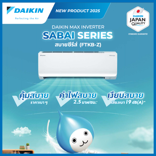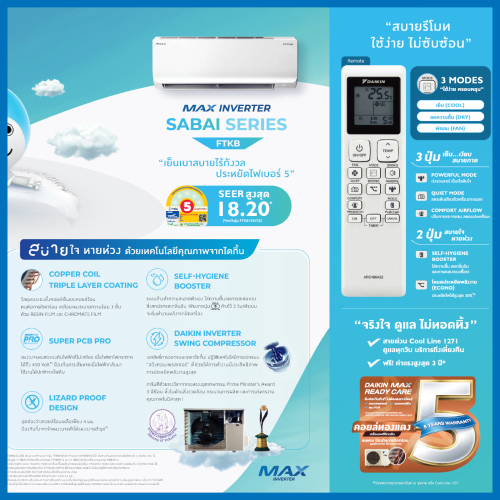 *** คุณสมบัติของเครื่องปรับอากาศ DAIKIN MAX INVERTER SABAI SERIES มีดังนี้ ***