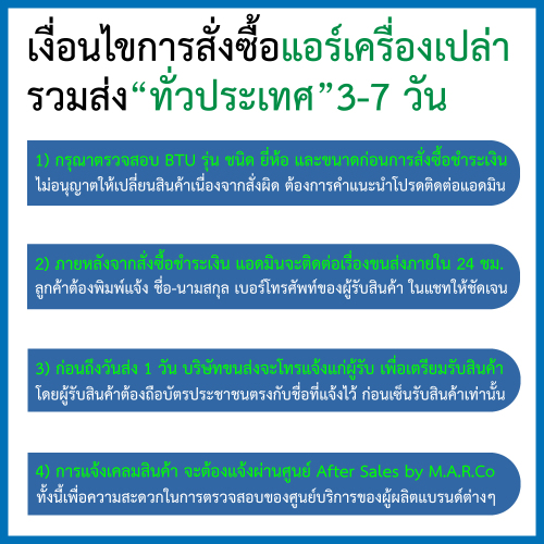 • รับประกัน : คอมเพรสเซอร์ 5 ปี, แผงคอยล์เย็น 3 ปี, อะไหล่ภายในเครื่อง 1 ปี