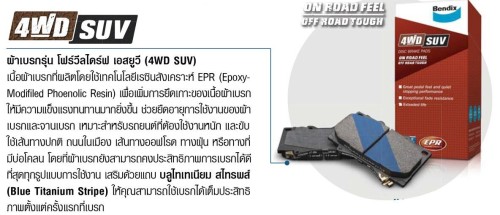 มั่นใจในเมือง สุดยอดทางออฟโรด ผ้าเบรกเบ็นดิกซ์รุ่น 4WD ถูกพัฒนาขึ้นมาสำหรับ รถยนต์ขับเคลื่อนสี่ล้อที่ต้องใช้งานหนักทั้งในเส้นทางปกติ, ถนนในเมือง หรือเส้นทางออฟโรด เส้นทางทุรกันดาร, ทางฝุ่น, ทางที่มีบ่อโคลน โดยผ้าเบรกจะคงประสิทธิภาพดีที่สุดในทุกรูปแบบ ของการใช้งานของรถยนต์ขับเคลื่อนสี่ล้อ ซึ่งเป็นผลมาจากส่วนผสมจากเทคโนโลยีเรซิ่นสังเคราะห์ EPR (ENHANCED PHOENOLIC RESIN) ที่เพิ่มการยึดเกาะเนื้อผ้าเบรกให้มี ความแข็งแรงทนทาน ช่วยยืดอายุของผ้าเบรกและจานเบรก สร้างความรู้สึกมั่นใจในทุกขณะที่ เหยียบเบรก ต่อต้านอาการเบรกหายเนื่องจากความร้อนสูงได้ดีเพราะสามารถทนความร้อนได้สูง สุด ถึง 380 องศาเซลเซียส และมีค่าอัตราความฝืดในระดับ FF
