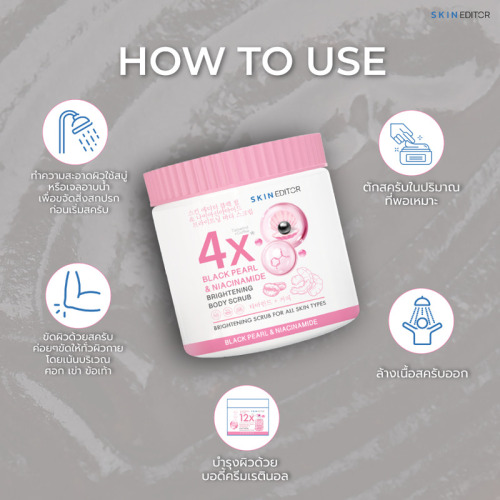 Skin Editor Black Pearl & Niacinamide Brightening Body Scrub 500g สครับสำหรับขัดผิวกาย เนื้อสครับละเอียด นุ่มละมุน อุดมด้วยสารสกัดจากไข่มุกสีดำที่มีกรดอะมิโนหลากหลายชนิด ช่วยให้ซึมเข้าสู่ผิวได้ดี ผสานสารสกัดจากผลมะขามที่ช่วยขจัดเซลล์ผิวที่เสื่อมสภาพแล้วอย่างอ่อนโยน มาพร้อมกลิ่นหอมอ่อนๆ จากกาแฟ ซึ่งปราศจากการแต่งสีและแต่งกลิ่น