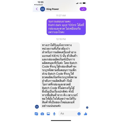 Vit C 75 mlป้ายคิง โค้ดที่กล่องและที่ขวด ตรงกันแค่ 3 ตัวแรก 3ตัวหลังไม่ตรงกัน สามารถเช็ควันผลิตได้จากโค้ดที่ขวด พนง. แจ้งว่าที่ไม่ตรงเพราะกล่องและฉลากข้างขวดผลิตคนละที่ สอบถามเพิ่มเติมได้ที่ call center 1631 หรือ 02-1348888 ต่อ 6406 ขอสาย BA kiehl คะ