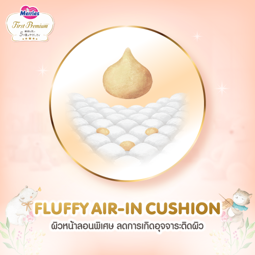 Fluffy Air-in Cushion สวมใส่สบาย ด้วยผิวหน้าลอนพิเศษระบายอากาศได้ดีทั่วทั้งแผ่น ช่วยป้องกันไม่ให้อุจจาระติดกับผิวลูกน้อย