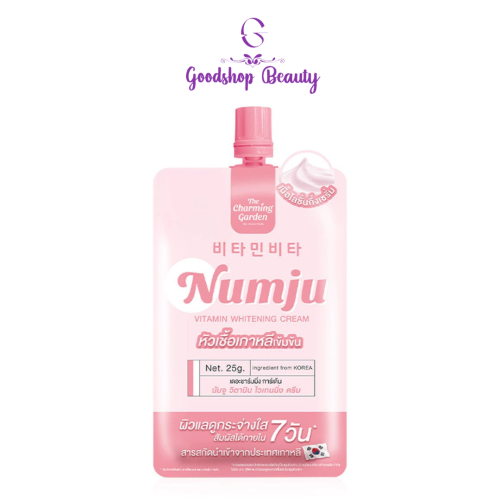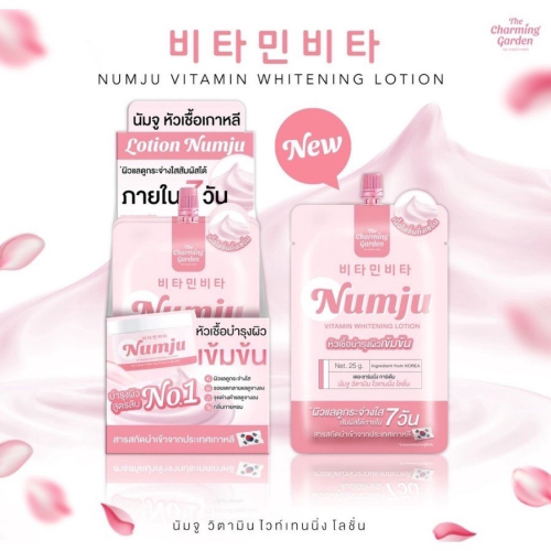 Numju Vitamin Whitening Cream 25gโลชั่นวิตามินเกาหลีเข้มข้น ทาง่ายซึมไวไม่ติดขน เนื้อโลชั่นหอมติดทนนาน มีส่วนผสมของ Jasmine, Organic Shea Butter, Hibiscus, Vitamin B3, Meadowsweet, Daisy, และ Glyceryl Ascorbate ช่วยปรับสภาพผิวกายให้แลดูสว่างใสสม่ำเสมอเรียบเนียนดูเป็นธรรมชาติ ช่วยลดรอยเเตกลาย สามารถทาเฉพาะบริเวณได้ แก้ปัญหาหัวเข่า ข้อศอก และรักแร้ดำ ช่วยผลัดเซลล์ผิวให้แลดูกระจ่างใสขึ้น