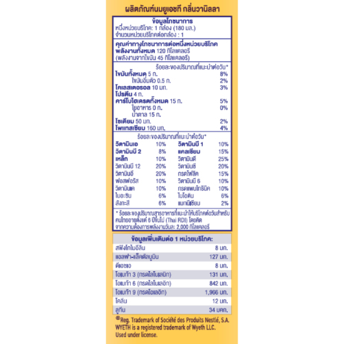 แลคโตส 6.8%, นมผงพร่องมันเนย 5.4%, น้ำมันพืชผสม (น้ำมันเรพซีด, น้ำมันทานตะวันที่มีกรดโอเลอิกสูง, น้ำมันทานตะวัน) 2.3%, เวย์โปรตีนเข้มข้นที่มีแอลฟา-แล็คตัลบูมิน 0.6%, วิตามินและเกลือแร่รวม 0.3%, น้ำมันปลาชนิดผงที่ให้ดีเอชเอ 0.1%, วัตถุเจือปนอาหาร (INS307b, INS304, INS301, INS322(i), INS471, INS332(ii), INS500(ii), INS460(i), INS466, INS407, มอลโทเดกซ์ทริน) แต่งกลิ่นธรรมชาติ (วานิลลา)