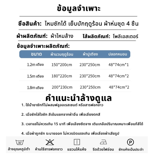 6 ฟุต(เหมาะสำหรับเตียงขนาด 1.5-1.8 เมตร):ผ้านวมหน้าร้อน:180*220cm / ผ้าปูเตียง:230*250cm / ปลอกหมอน:48*74cm*2