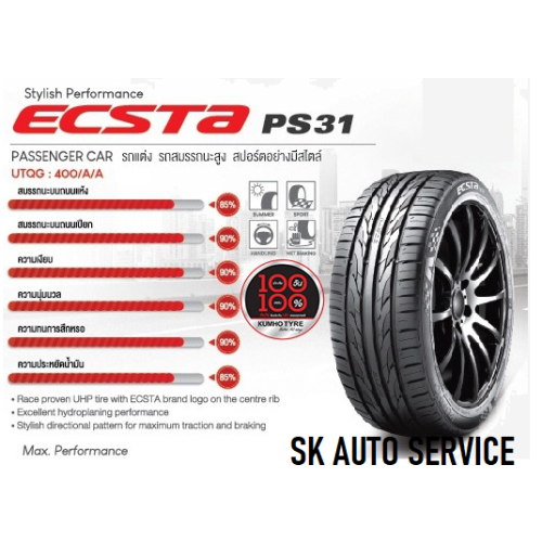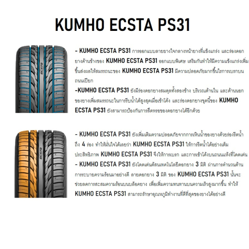ยางสมรรถนะสูง Ultra High Performace ตอบสนองทุกการขับขี่ไปกับยางรถยนต์ยอดขายอันดับ 1 ในเกาหลี "KUMHO" ECSTA PS31 ยางสปอร์ตสมรรถนะสูง คุณภาพเยี่ยม ยางรีดน้ำมั่นใจด้วยสมรรถนะแห่งการควบคุมอย่างเหนือชั้นทุกสภาวะการขับขี่ ขับขี่ปลอดภัย
