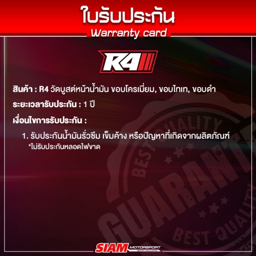 - รับประกันน้ำมันรั่วชึม เข็มค้าง หรือปัญหาที่เกิดจากผลิตภัณฑ์ ไม่รับประกันหลอดไฟขาด
