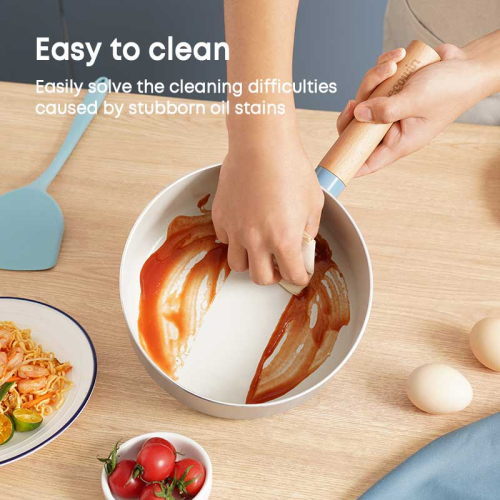 โปรดปล่อยให้เครื่องครัวของคุณเย็นลงอย่างสมบูรณ์ก่อนซักเพื่อหลีกเลี่ยงการกระแทกจากความร้อน จากนั้นทำความสะอาดด้วยน้ำสบู่อุ่น ๆ และฟองน้ำนุ่ม ๆ เครื่องล้างจานปลอดภัย แต่การล้างมือจะดีกว่าสำหรับการดูแลกระทะ (โปรดอย่าแปรงหม้อด้วยวัตถุแข็งเช่นลูกเหล็ก เนื่องจากการเคลือบ nonstick มีความนุ่มแปรงแข็งจะทำให้เกิดรอยขีดข่วนและการเคลือบอาจหลุดออก)