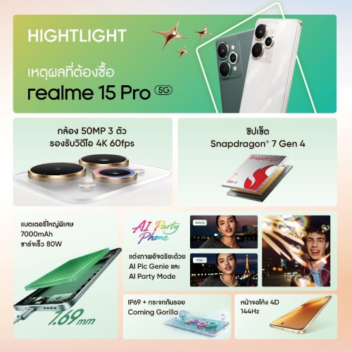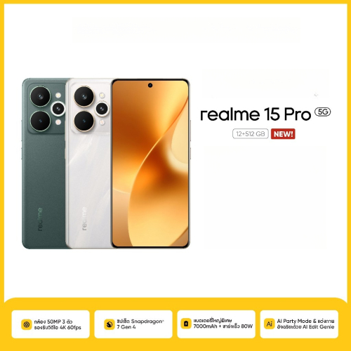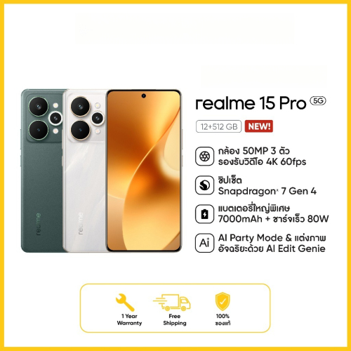 Product Details Reviews (0) Add to Cart Home Product Details [New]realme 15 Pro [12+512] 5 3 [New]realme 15 Pro [12+512] ฿ 16,999.00 2%off Promotion Time-limit offer Time-limit offer 1-7 Apr. Tcoin Earn up to Tcoins Tcoins can be used as a deduction for the next purchase of Thisshop product; the received Tcoins will be calculated based on the actual payment amount. Ship to Province City Area Shipping Quantity Add to Cart Buy Now TPayLater Product Details Reviews (0) After Sale Support