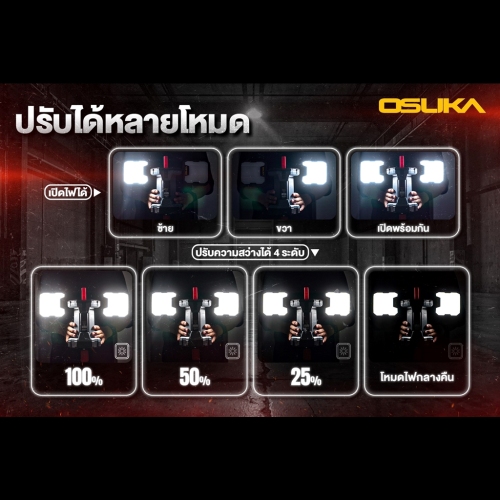 ปรับได้หลายโหมด เลือกเปิดไฟด้านซ้าย ขวา หรือเปิดพร้อมกัน และ ปรับความสว่างได้ 4 ระดับ 100% - 50% - 25% - โหมดไฟกลางคืน