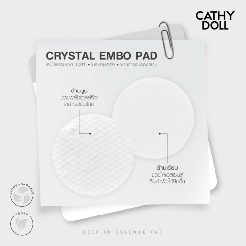 เอสเซนส์แพด สูตร Deep in Clear สำหรับผู้ที่มีผิวมันและเป็นสิวง่าย ที่มาพร้อม Crystal Embo Pad แพดเจลลิ่งนุ่มพิเศษ ที่ผลิตจากเส้นใยธรรมชาติ 100% สามารถย่อยสลายได้เองตามธรรมชาติ และผ่านการรับรองวีแกน ให้สัมผัสนุ่ม แนบสนิทกับผิว ช่วยดูดซับและส่งผ่านเอสเซนส์สู่ผิวได้เต็มประสิทธิภาพ ให้ผิวรู้สึกเย็นสบายทันทีที่ใช้ พร้อมบำรุงด้วยนวัตกรรมสารสกัด ที่ได้รับการจดสิทธิบัตรจากประเทศเกาหลีใต้ ด้วย Anti Sebum P สารสกัดรวมจากพืช 4 ชนิด คือ สารสกัดจากใบสน รากของต้นอุลมัส ดาวิเดียน่า ดอกอีฟนิ่งพริมโรส และรากของต้นคูซู ช่วยควบคุมความมัน กระชับรูขุมขน และลดสาเหตุของการเกิดสิวได้อย่างอ่อนโยน พร้อมด้วยสาร Derma-Clera ซึ่งเป็นสารที่ได้รับสิทธิบัตรที่สกัดจากรากงาขาว ช่วยปลอบประโลมและเสริมความแข็งแรงของการป้องกันผิว พร้อมด้วย ซิงค์ พีซีเอ ช่วยควบคุมความมันซึ่งเป็นสาเหตุของการเกิดสิว กรดแลคติก ช่วยผลัดเซลล์ผิวอย่างอ่อนโยน และสารสกัดใบบัวบก ที่ช่วยปลอบประโลมผิวที่ระคายเคืองได้อย่างอ่อนโยน ฟื้นบำรุงผิวให้สดชื่นพร้อมรับการบำรุงในขั้นตอนต่อไป ที่มั่นใจได้ในความอ่อนโยน ปราศจากสารที่ก่อให้เกิดการระคายเคือง 10 ชนิด Alcohol Free, Paraben Free, Fragrance Free, Sulfate Free, Colorant Free, Silicone Free, Mineral Oil Free, Microplastic Free, Hydroquinone Free และ Phthalates Free