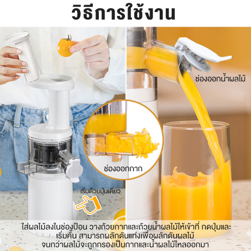 1.ใส่ผลไม้ลงในช่องป้อน วางถ้วยกากและถ้วยน้ำผลไม้ให้เข้าที่ กดปุ่มและเริ่มคั้น สามารถผลักดันแท่งเพื่อผลักดันผลไม้